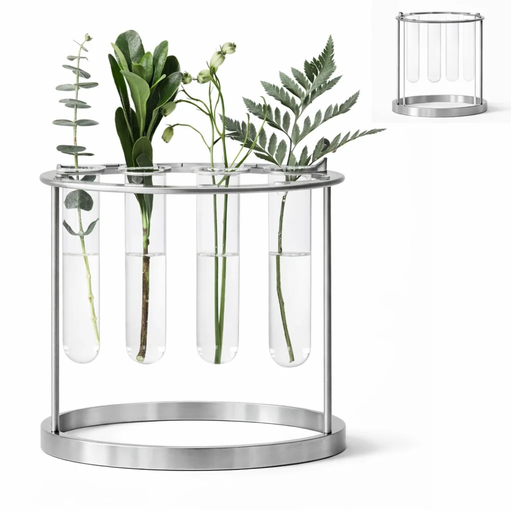 Paslanmaz Çelik Camlı Çiçeklik, laboratuvar tüp formundan ilham alan cam hazneleri ve modern metal taşıyıcısıyla mekâna yalın ama sofistike bir görünüm kazandırır.