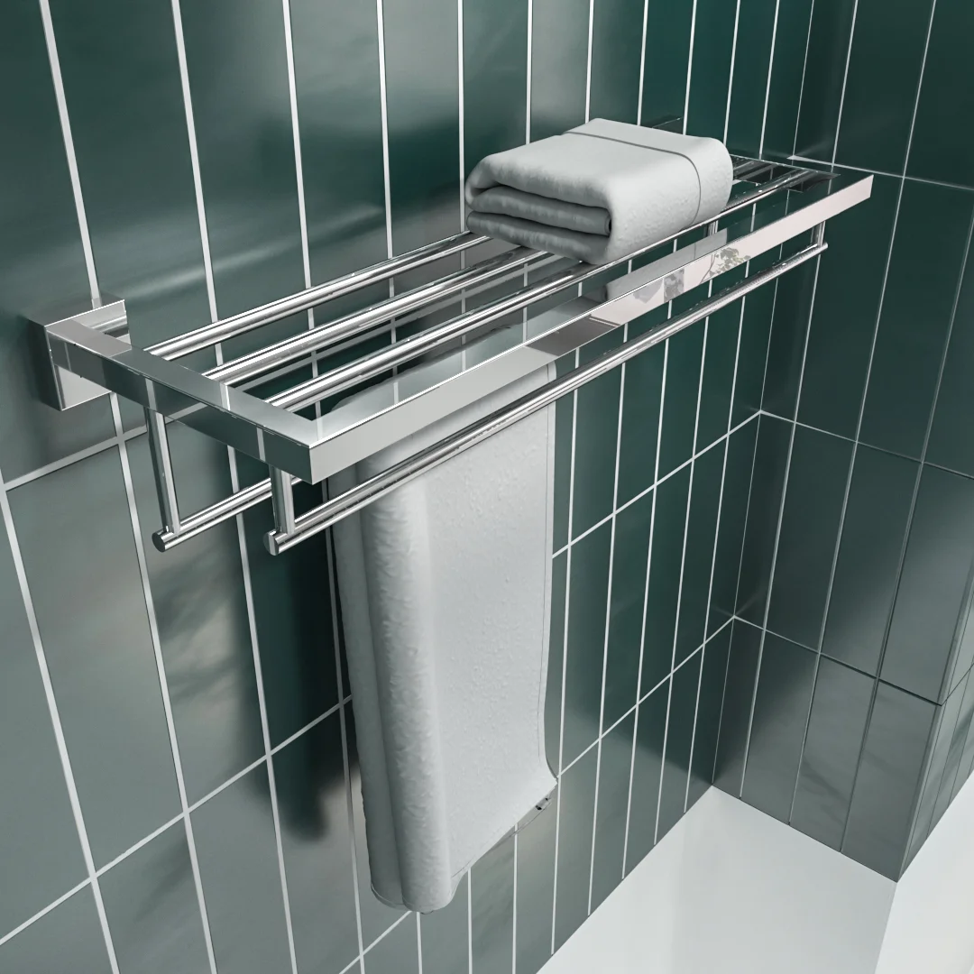 Paslanmaz Çelik Raflı Havluluk, banyo alanlarında hem depolama hem de havlu asma ihtiyacını tek üründe birleştiren fonksiyonel bir banyo aksesuarıdır.